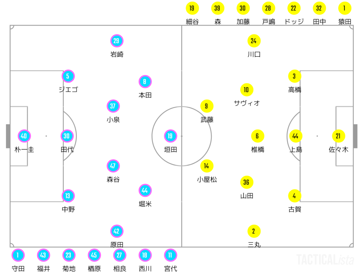 鳥栖が配置変更。3バックが右から原田、田代、中野伸に、WBが左ジエゴ、右岩崎に。また小泉がアンカー、森谷と堀米がIH、本田がトップ下のように中盤も微調整。