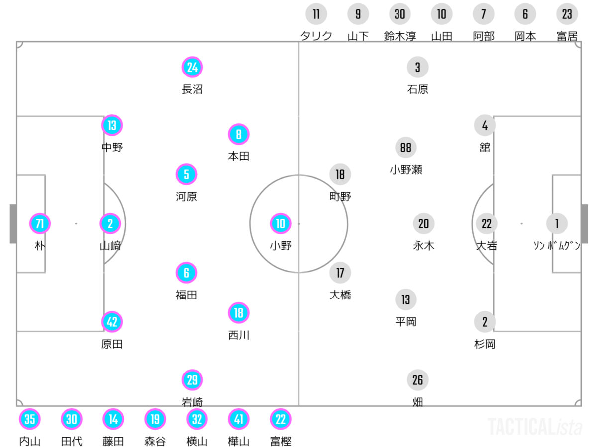 田代と山﨑の2CB、左SBに長沼、右SBに原田が入る4バックに変更。